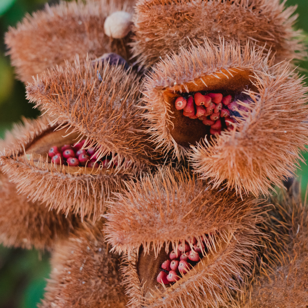 Conocida como achiote o urucum, la semilla de roucou crece dentro de vibrantes vainas espinosas nativas del Amazonas. Durante siglos, las comunidades indígenas utilizaron su rico pigmento rojo para proteger y embellecer la piel. Hoy en día, esta semilla sigue siendo una de las fuentes naturales más poderosas de carotenoides, ayudando a defenderse de los radicales libres y a restaurar un brillo radiante y saludable.