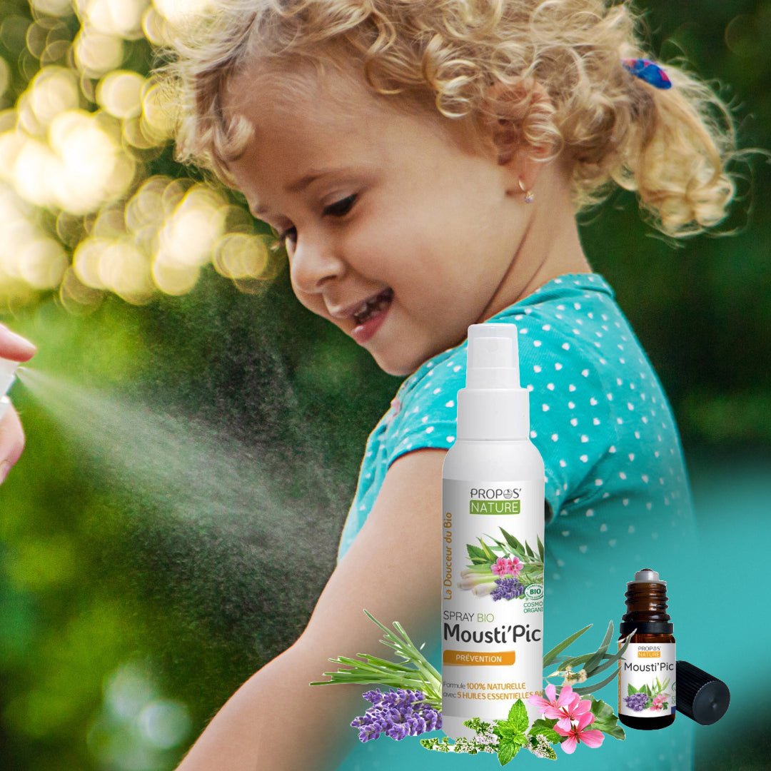 Experimente el poder de la naturaleza con nuestro spray repelente de mosquitos orgánico Mousti'Pic, formulado con ingredientes 100% naturales. Este spray preventivo combina una sinergia única de cinco aceites esenciales orgánicos: lavanda verdadera, geranio rosa, hierba de limón de Java, eucalipto de limón y menta. Mousti'Pic no sólo ayuda a mantener a raya a los mosquitos sino que también ofrece un alivio calmante.