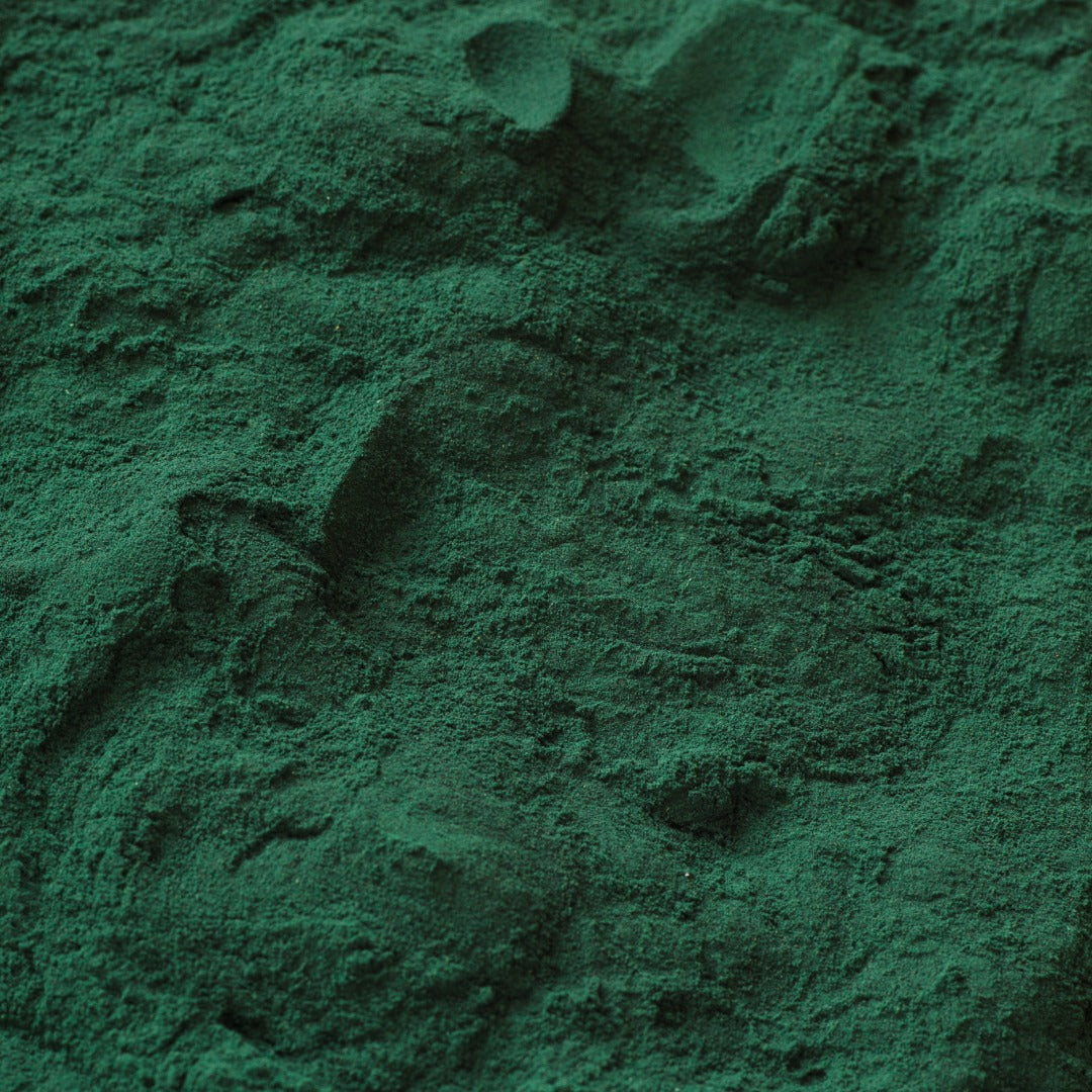Superalimentos para el apoyo inmunológico incluyendo Espirulina, Chlorella, Semillas de Chía, Matcha y Reishi, ricos en antioxidantes, vitaminas y minerales.