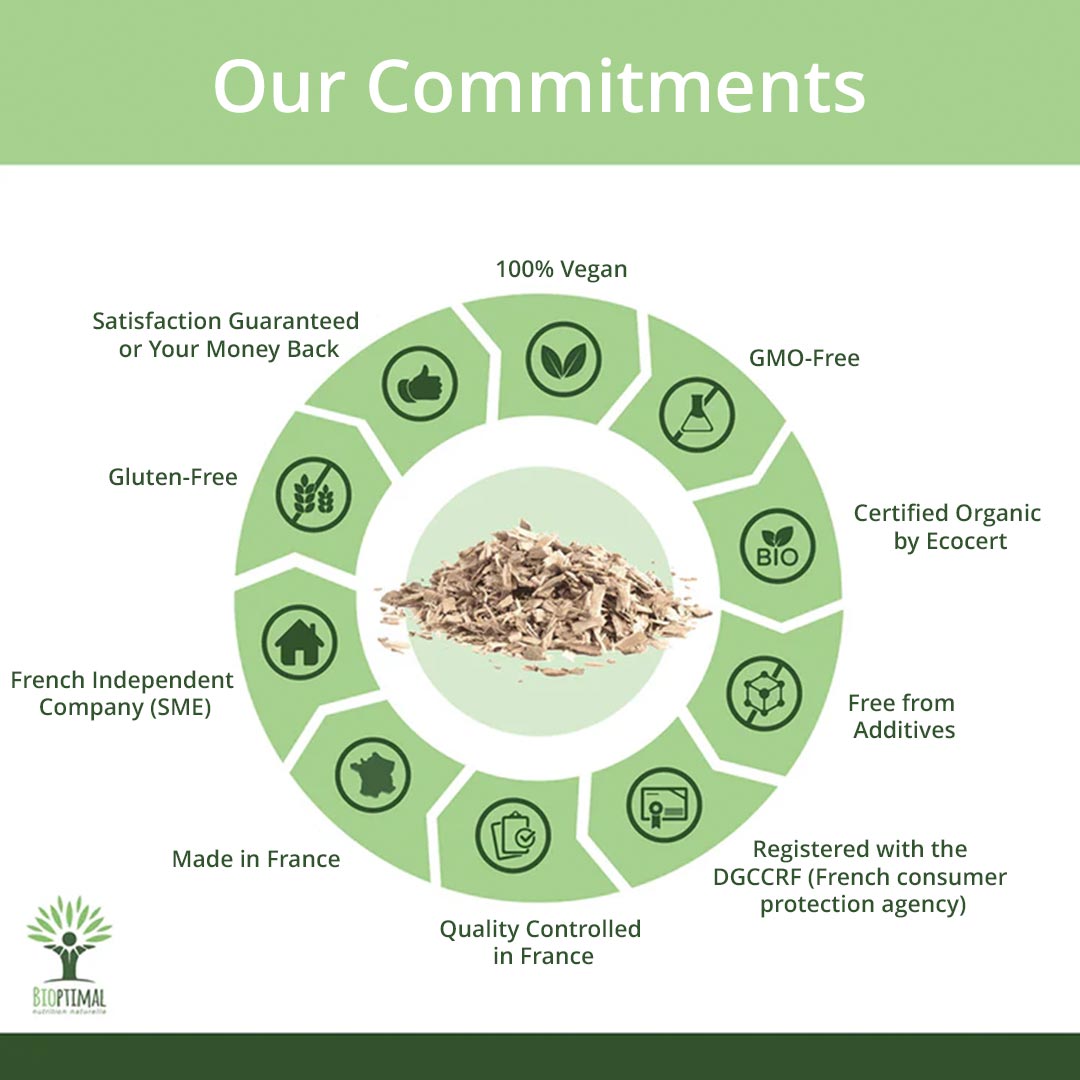 Orgullosamente hecho en Francia, nuestros suplementos se elaboran con cuidado bajo estrictos controles de calidad. Encapsulamos nuestra Corteza de Sauce Blanco en cápsulas de origen vegetal - no en tabletas - para evitar sustancias controvertidas como talco, estearatos o carbonato de magnesio.