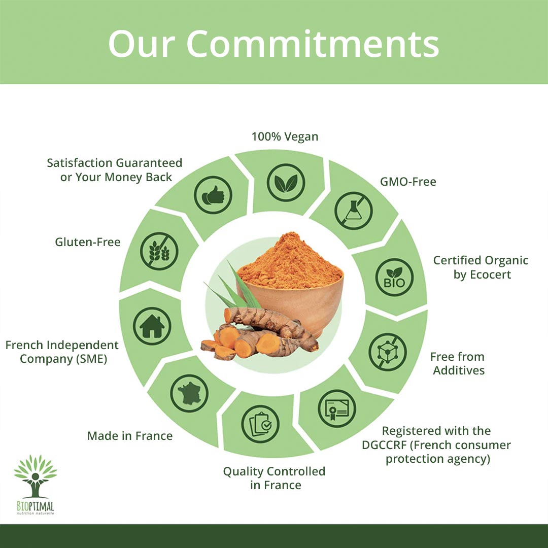 Producidos en Francia, nuestros suplementos están encapsulados en cápsulas de origen vegetal, no en tabletas, para evitar sustancias controvertidas como el talco, el estearato o el carbonato de magnesio. Nuestra fórmula está libre de aditivos, agentes de carga, OGM, pesticidas y gluten, y se somete a rigurosas pruebas de laboratorio para garantizar su pureza y calidad. Certificados como orgánicos y fabricados de manera sostenible para su tranquilidad.