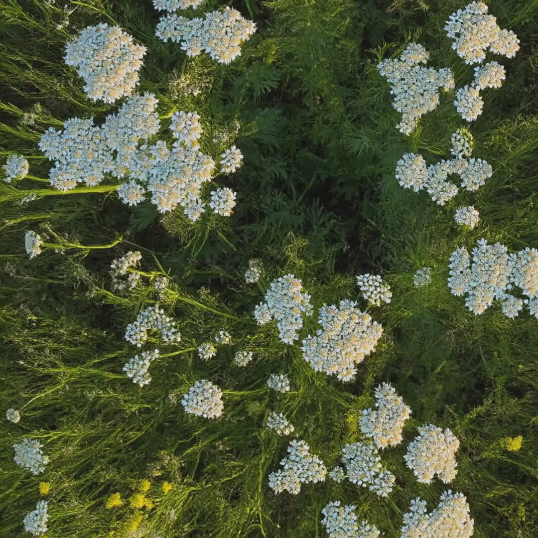 The delicate white flowers of yarrow are harvested at the end of summer, usually in August, when the plant is at its aromatic peak. Although the essential oil yield is very low - similar to rose - the hydrosol is fortunately more abundant and equally valued for its many beneficial uses.