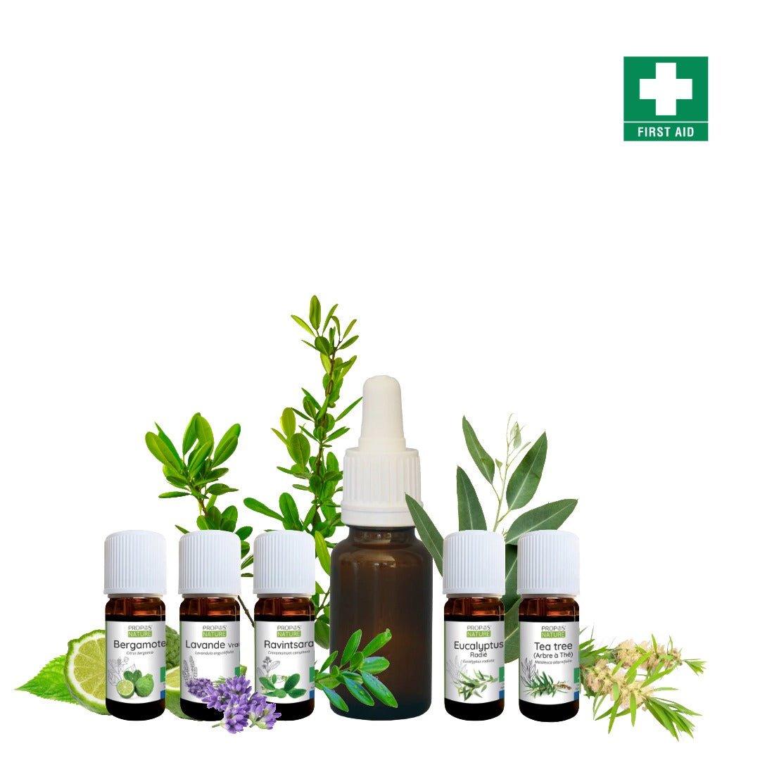 This natural First Aid Washing Mix is a gentle, plant-based blend designed to cleanse and protect the skin. Combining lavender, tea tree, ravintsara, eucalyptus radiata, and bergamot essential oils, it offers purifying and soothing care for minor cuts, grazes, and everyday skin irritations.